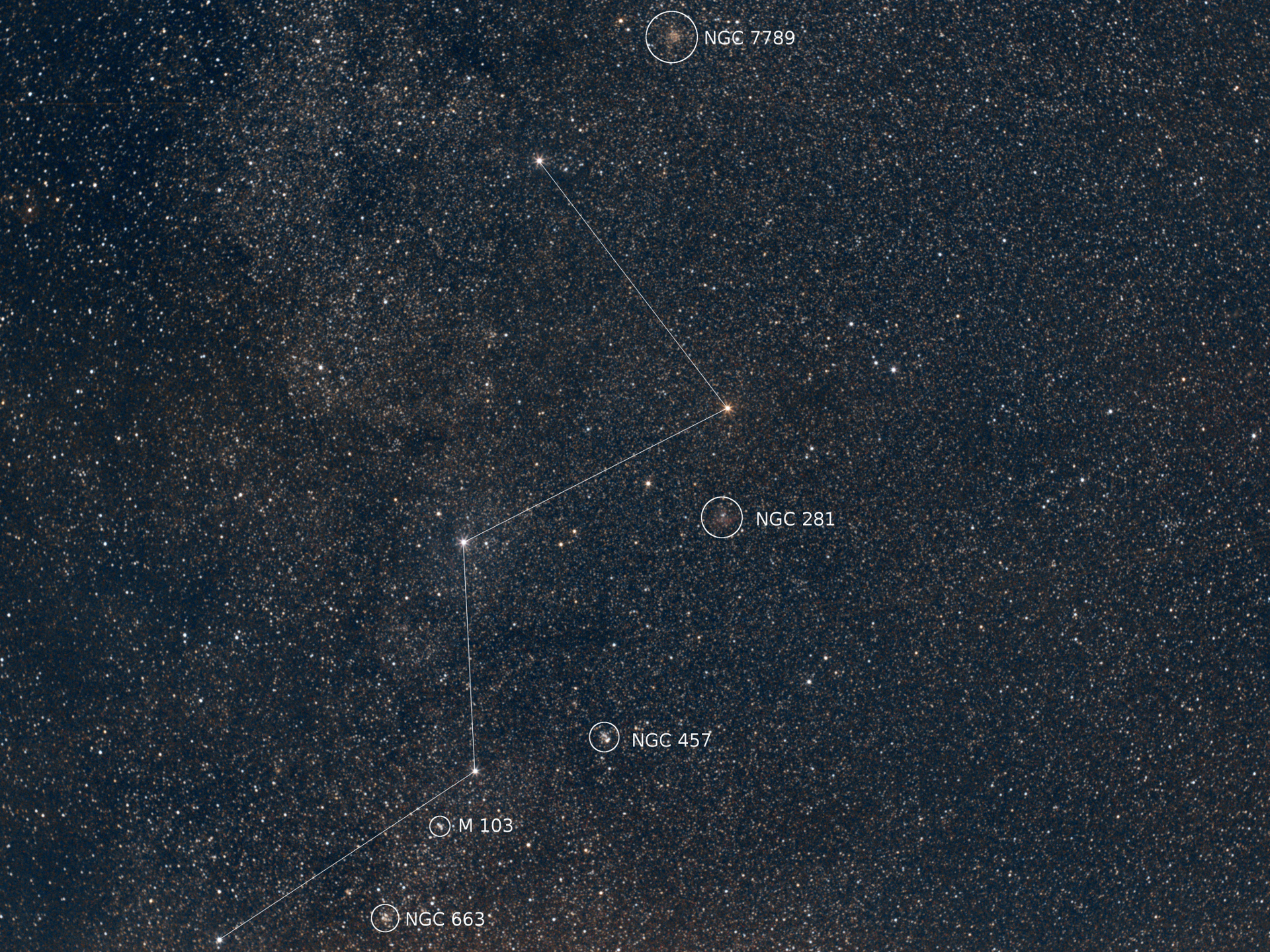 16' NGC 281: Emissionsnebel, Entfernung ca. 9500 Lj., Winkelausdehnung 35' x 30' NGC 457: Eulenhaufen Messier 103 NGC 663: offener Sternhaufen, Entfernung ca. 6400 Lj., Winkelausdehnung 15' |
