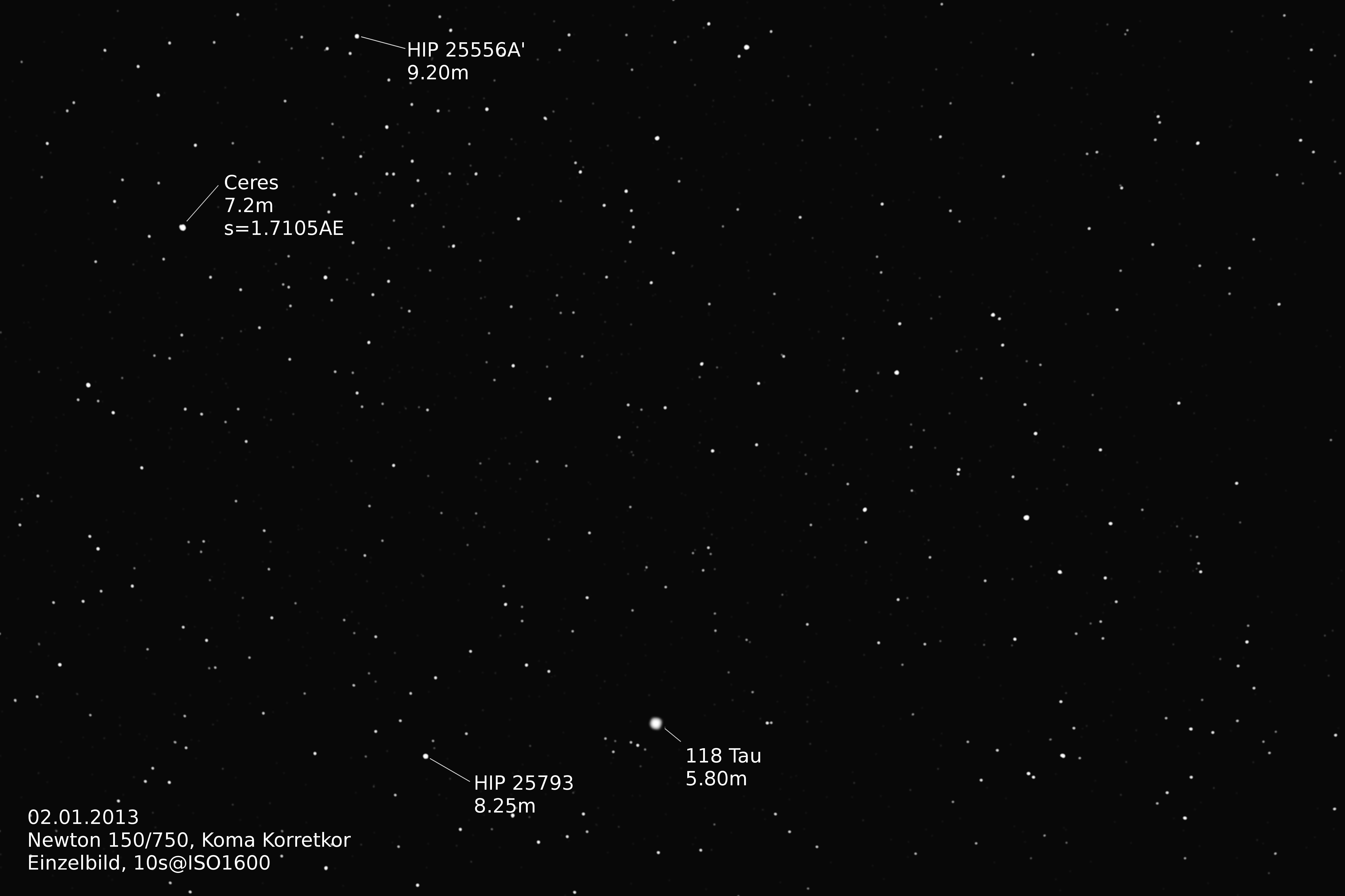 Scheinbare Helligkeit 8.8mag, scheinbare Größe 0.5 arcsec, Entfernung 2.59AE=387.8 Mio. km, Durchmesser ca. 848km |