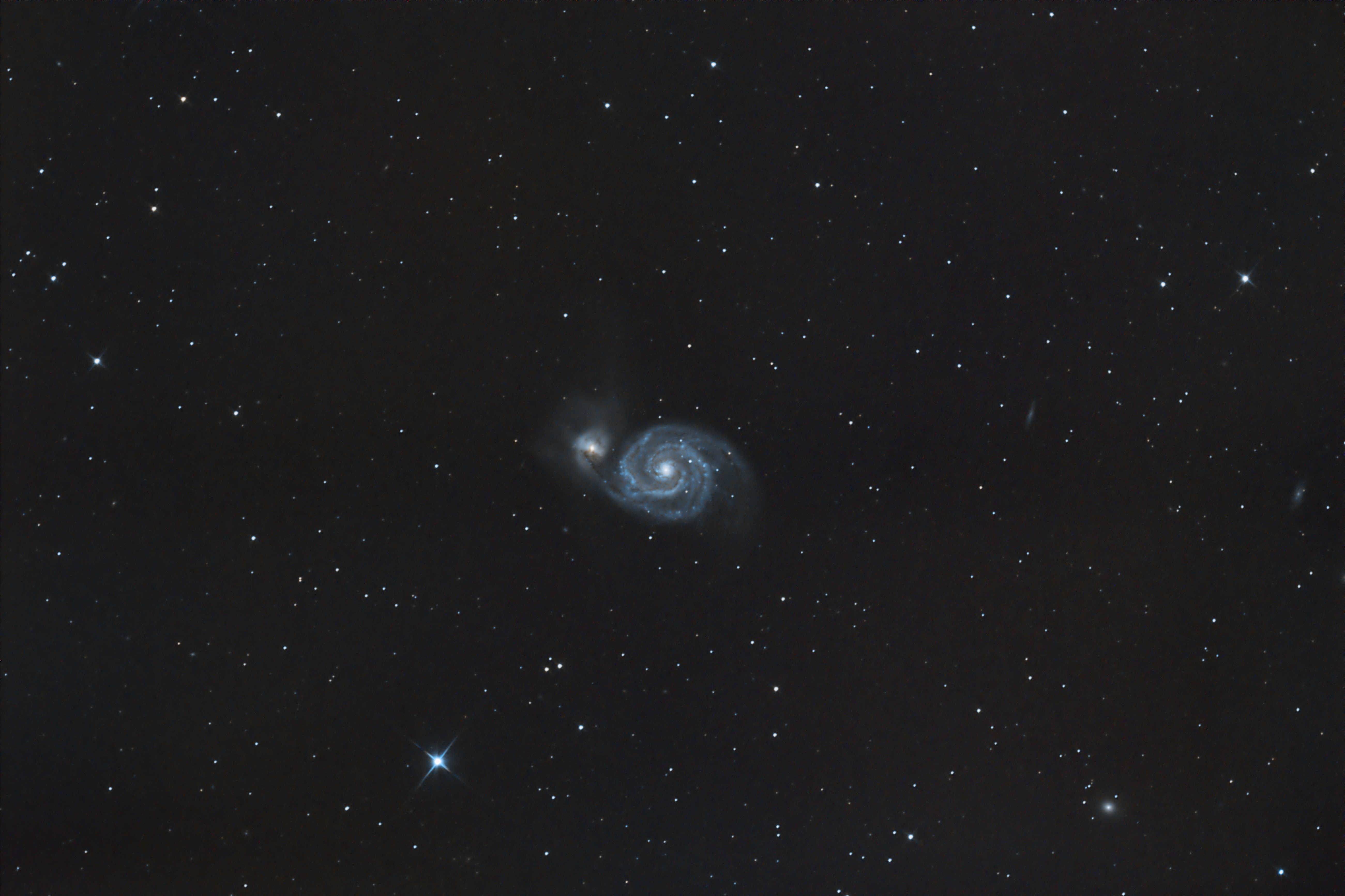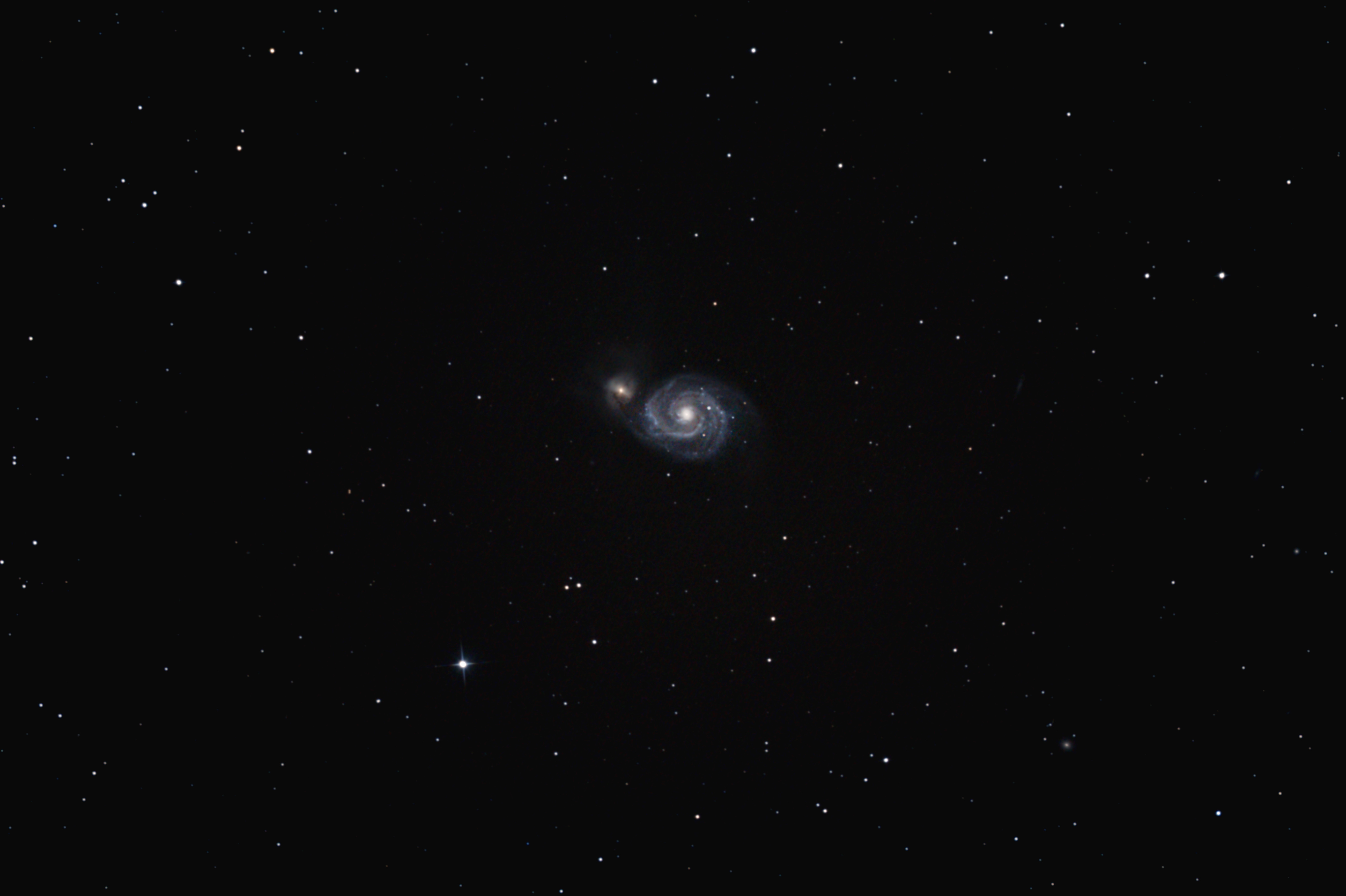 Der erste Versuch mit dem neuen vierlinsigen Komakorrektor. Im Gegensatz zum zweilinsigen Korrektor bleibt die Brennweite des Teleskops voll erhalten und der Fokuspunkt rückt nach hinten. Leider ist Bewölkung aufgezogen, so dass nur 7 Bilder verwertbar waren. |
