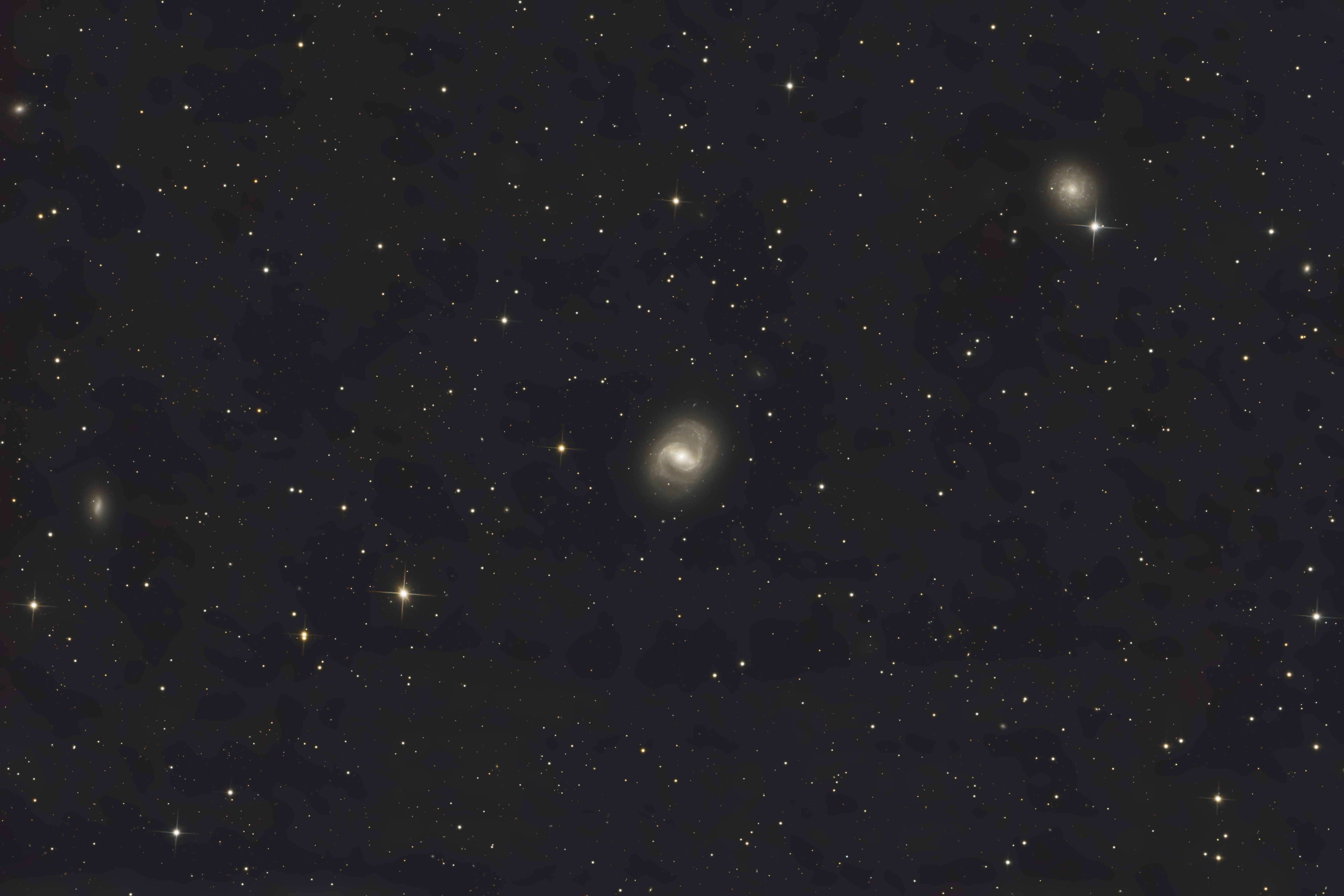 Viele Probleme bei Guiden mit schlechtem RMS-Wert von zeitweise 5''! Deconvolution mit BlurXTerminators wirk Wunder. M91 ist die Spiralgalaxie in der Mitte, rechts oben sieht man die Galaxien NGC4571 und am linken Bildrand NGC4516. |